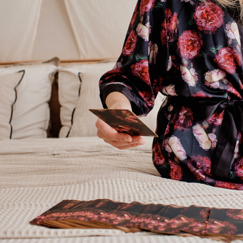 There's nothing like slipping into something comfortable after a long, stressful day. Clothing can make such a positive impact on your mood, leaving you feeling more relaxed. That's the intention of the Kaia reversible robe! It's made with buttery soft satin and has two sides: one is minimalist black, while the other is adorned with Kefalonia roses. In case you didn't notice... it matches our Midnight Black tarot deck!
